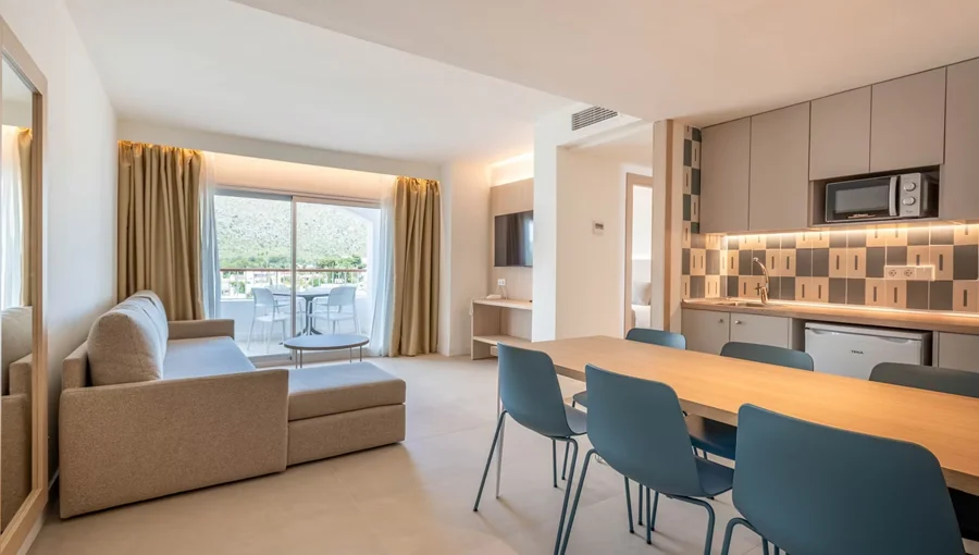 The 3-star Sol de Alcudia Apartments in Majorca is well located, has 2 and 3 bedroom apartments AND offers half board dining. That means you don't have to worry about cooking dinners, even though you've got a well equipped kitchen area.