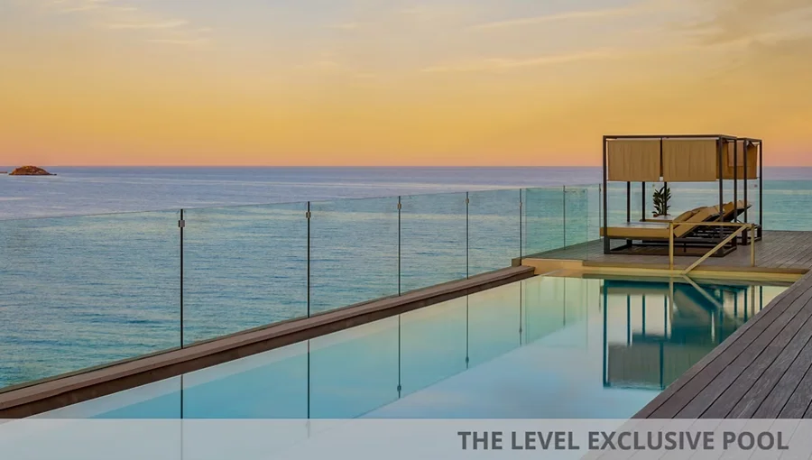 The two outdoor swimming pool terraces have stunning panoramic views out to the Mediterranean Sea, one is The Level upgrade.